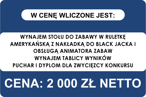 W cen� tej propozycji wliczony jest st� wraz z nak�adk� do Ruletki Ameryka�skiej i nak�adk� do Black Jacka. Jak we wszystkich naszych pakeitach gra jest prowadzona przez zawodowego krupiera. Gracze, kt�rzy uzyskaj� najlepsze wyniki dostan� w nagrod� puchar i dyplomy.