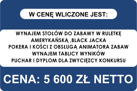 Oferta organizacja kasyna na 4 sto�ach do zabawy w Pokera, Black Jacka, Ruletki i Kosci. Ka�dy ze sto��w b�dzie obs�ugiwany przez zawodowego krupiera. Najlepsze wyniki poszczeg�lnych graczy zapisywane b�d� na tablicy wynik�w, a uczestnicy, kt�rzy zdob�da najwi�ksz� liczb� punkt�w dostan� puchar i dyplomy.