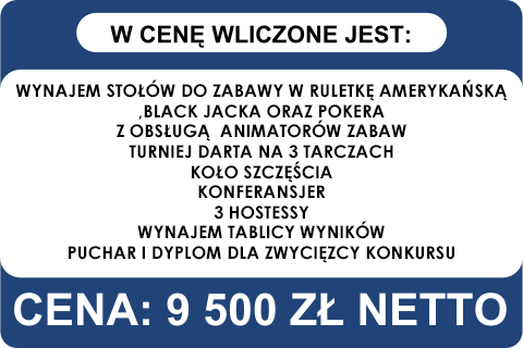 W Pakiecie VIII do dyspozycji uczestnik�w zabawy s� 3 sto�y do Ruletki, Black Jacka oraz Pokera oraz mistrzostwa darta na 3 tarczach. Ob�ug� imprezy stanowi konferansjer prowadzo�cy, 3 hostessy, 3 krupier�w oraz s�dzia turnieju Darta. W pakeicie znajduj� si� r�wnie� Ko�o Szcz�cia, zabawa z fikcyjn� walut� oraz profesjonalna oprawa muzyczna.