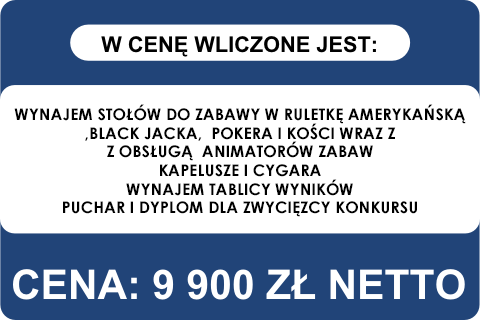 Jest to propozycja imprezy kasynowej na czterech sto�ach do Black jack'a, Ruletki, Pokera oraz Ko�ci. Uczestnicy gra� b�d� o fikcyjn� walut� - sztosy. Konferansjer razem z 3 hostessami poprowadzi ca�� imprez�, a profesjonalni krupierzy zajm� si� obs�ug� sto��w kasynowych. Dodatkowo ka�dy uczestnk�w otrzyma na wej�ciu stylowy kapelusz oraz cygaro.